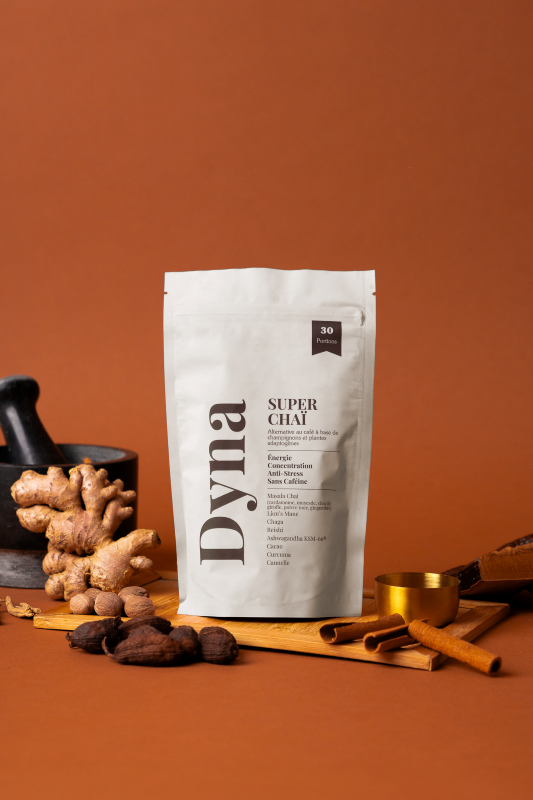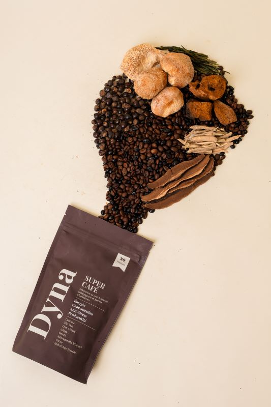 - Super Café Dyna – café végétal, champignons comme le reishi, lion’s mane, chaga, guarana : ouverture d’esprit, clarté mentale, dose de dynamisme.