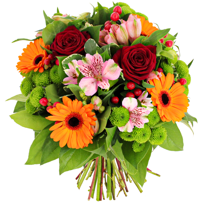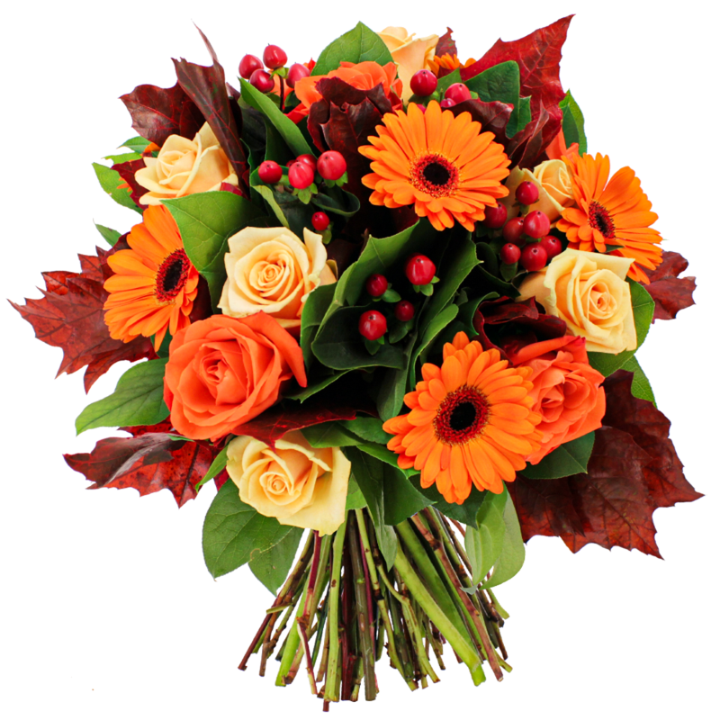 • Fauve : un bouquet rond dans les tons orange, rouge et rose pâle, composé de roses, alstromérias, lisianthus et feuillages automnaux.