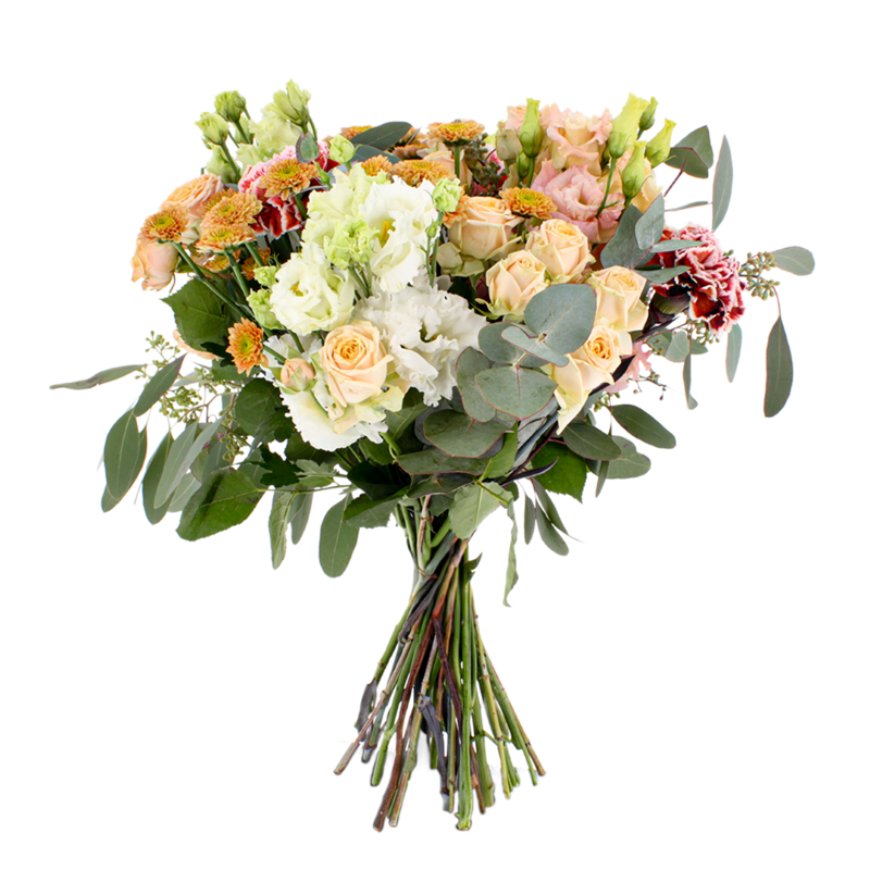 • Terranova : un bouquet tout en douceur, dans les tons crème et terracotta, avec œillets, roses et lisianthus.