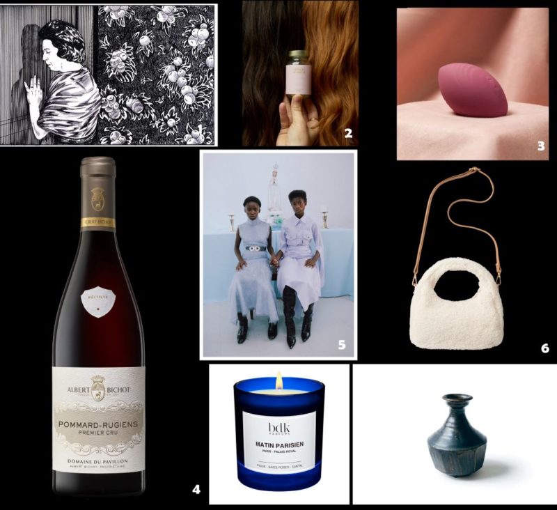 1/ Mathieu PAUGET | BACK IN BLACK ‘ L’envie de faire des petits traits de partout, de laisser de côté la couleur, un temps, pour se concentrer sur le dessin, les valeurs, les ambiances, suer aussi sur mes feuilles grâce à la canicule. ‘・ 2/ APNEE | Crinière de Sirène est l’une des cures cheveux les plus concentrées du marché, son efficacité est cliniquement prouvée. ・3/ PASSAGE DU DÉSIR | Galet vibrant Milos de Hyyo ・ 4/ Albert Bichot | Pommard Premier Cru “Rugiens” 2022. Après une macération fermentaire précise en cuves bois thermorégulées et un élevage de 16 mois en fûts de chêne (dont 35 % de bois neuf), ce Pommard dévoile une belle complexité aromatique, portée par des arômes de cerise et framboise, subtilement soulignés par un boisé fumé fondu. En bouche, la structure est puissante mais maîtrisée, les tannins sont racés, et la longueur remarquable.・5/ Thebe Magugu・6/ Sac U Collection・7/ Bougie Matin Parisien de la collection Les Nocturnes signée BDK Parfums・8/ MOGI Folk Art | Bouteille à saké “tokuri” en céramique noire coréenne de la période Joseon.
