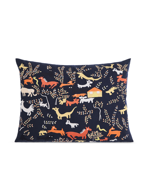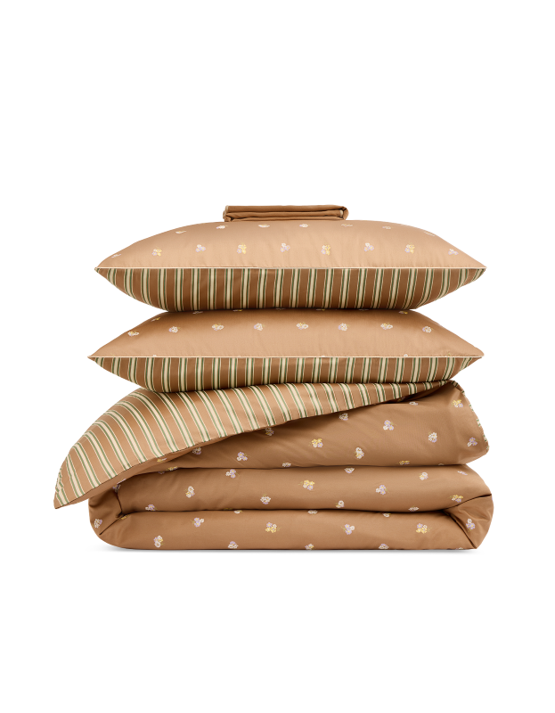 Deux univers complémentaires se dévoilent : Jardin Royal, lumineux et raffiné, en satin de coton, qui évoque l’abondance d’un jardin en fleurs ; et Bosquet d’Hiver, plus feutré, plus intimiste, en percale de coton, qui capture la chaleur réconfortante des intérieurs hivernaux. Chacun raconte une saison, une atmosphère, une façon de vivre la maison.