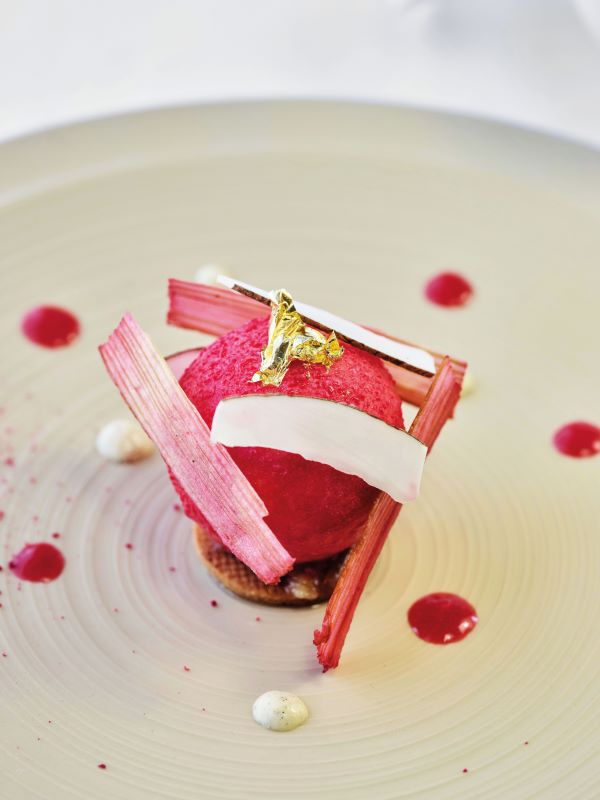 Dressez la sphère au milieu de l’assiette. Réalisez des points de coulis coco et fraise. Déposez des chips de rhubarbe et des copeaux de noix de coco.