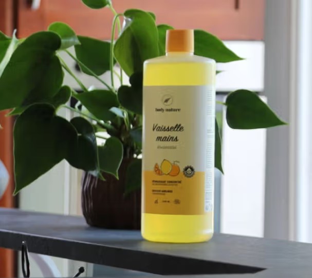 ✦ Vaisselle. Ce liquide vaisselle est ultra-concentré : quelques pressions suffisent pour nettoyer et dégraisser toute la vaisselle, y compris les ustensiles de bébé. Le Vaisselle mains s’utilise pur ou dilué pour une efficacité adaptée aux besoins. Dans sa démarche de réduction d’utilisation des ressources, Body Nature a réalisé des tests de phyto-toxicité sur des plants de tomates qui ont confirmé que l’eau de rinçage du Vaisselle mains peut être réutilisée pour arroser les plantes.