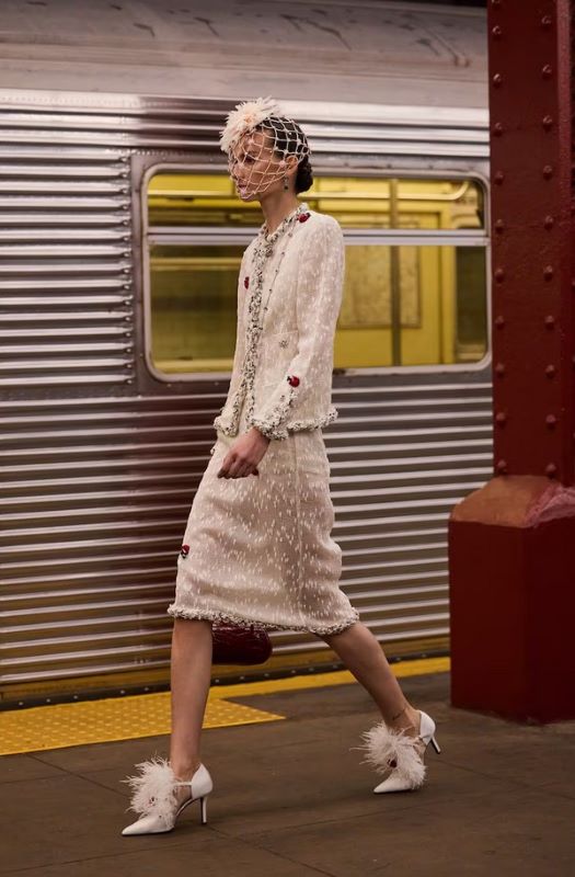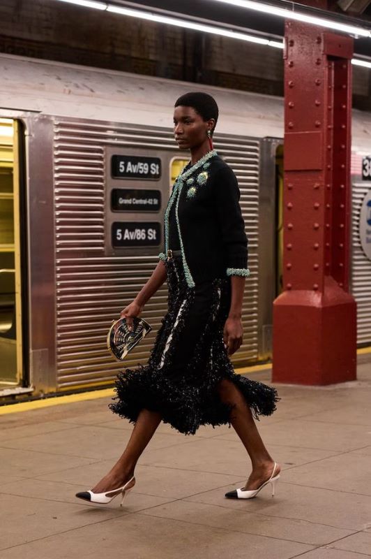 Ce fut l’heure de pointe la plus fabuleuse qui soit : une station de métro dédiée à Chanel, desservie par la ligne express de la 5e Avenue et peuplée d’une quatre-vingtaine de femmes archétypes et personnages types de l’Amérique, toutes vêtues de manière extraordinaire. Elles représentaient à la fois un échantillon représentatif du passé et du présent de New York, du style contemporain et la maîtrise époustouflante de Chanel dans l’art de la création, qui est au cœur de ses collections Métiers d’Art annuelles.