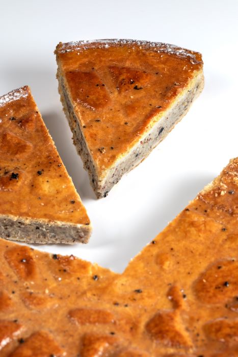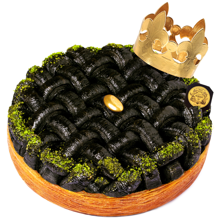 Sous une pâte feuilletée dorée à souhait, la garniture s’inspire des trésors de la terre : une alliance subtile de crème d’amandes et de truffes noires finement râpées, sublimée par un léger parfum de caviar de truffe. La galette, d’une profondeur en bouche rare, se distingue par l’intensité de ses saveurs, où l’umami de la truffe se mêle harmonieusement à la douceur délicate de la frangipane.