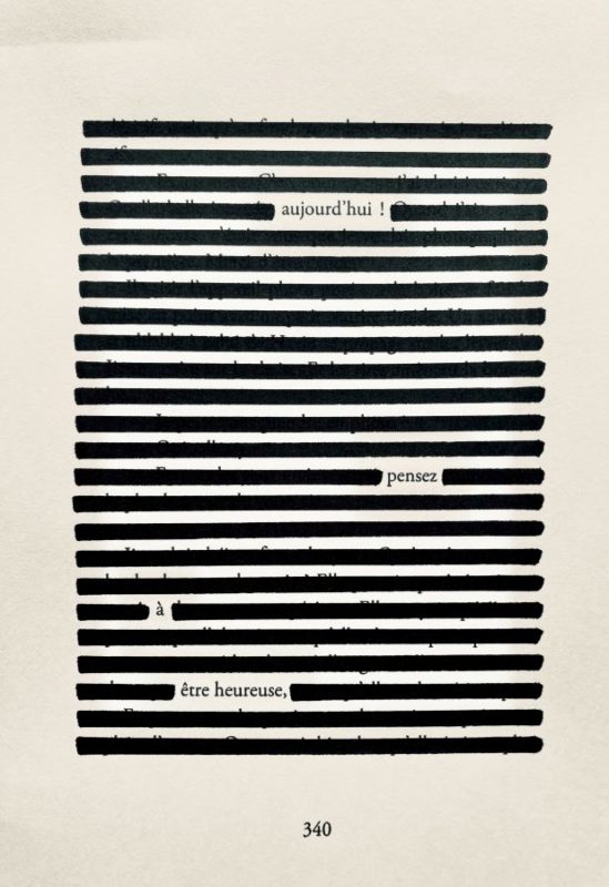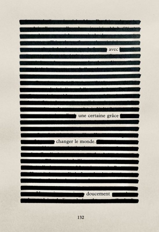 J’ai créé le «Haiku marinière», dont le principe est d’écrire des haikus et des poèmes courts dans des pages de livres. Je trace des lignes parallèles au feutre sur le texte des romans imprimés et ne laisse apparaître que quelques mots qui, ensemble, créent un poème court qui n’a rien à voir avec le texte original. À travers cette forme d’expression, je fais apparaître dans des pages ordinaires la poésie cachée. Dimitri Rataud