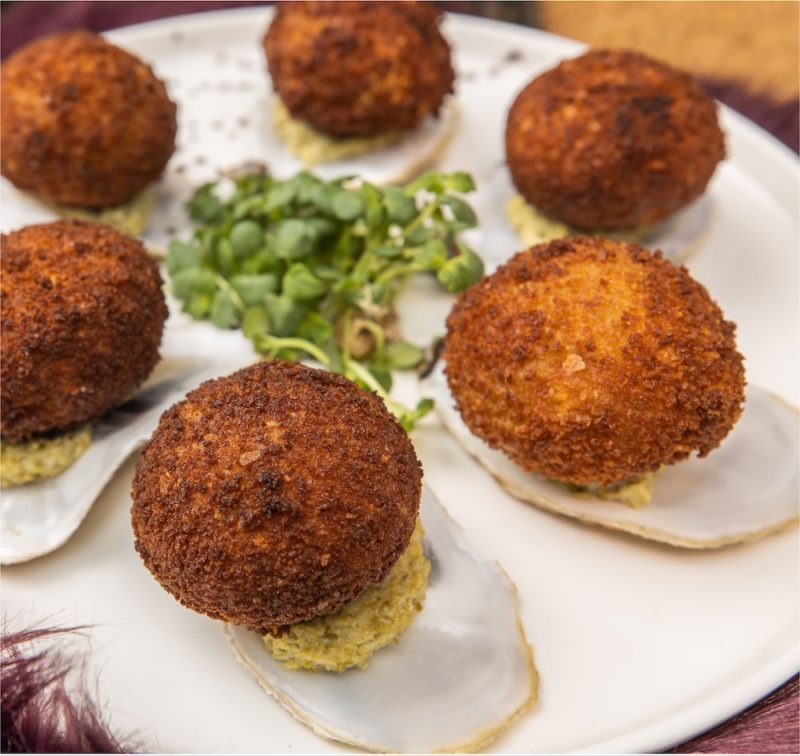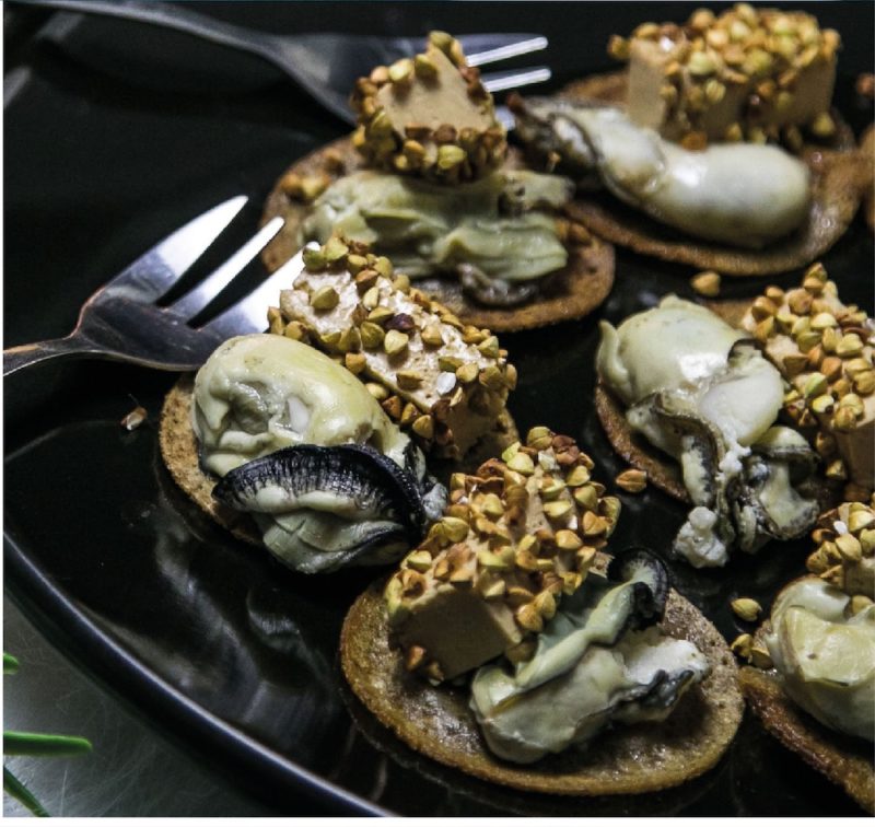 Parmi ces interprétations festives, les cromesquis d’huîtres sont devenus une véritable signature. Ils offrent un contraste délicieux entre le cœur fondant et iodé de l’huître et le croquant chaud de la panure. L’huître y est tout d’abord ouverte, décoquillée puis rapidement raidie à feu vif, avant d’être enrobée d’un beurre parfumé à la truffe. Façonnée en sphère, refroidie puis panée à deux reprises, elle devient une bouchée dorée et croustillante après quelques minutes en friture. Déposée sur son coquillage nacré avec une pointe de sauce tartare, elle se présente comme un amuse-bouche spectaculaire, à la fois raffiné et généreux, qui revisite les codes de la dégustation sans jamais les trahir. Une façon moderne et irrésistible d’introduire les fêtes en mariant terroir, technique et gourmandise. On l’aime aussi associée au foie gras et au sarrasin grillé, un must !